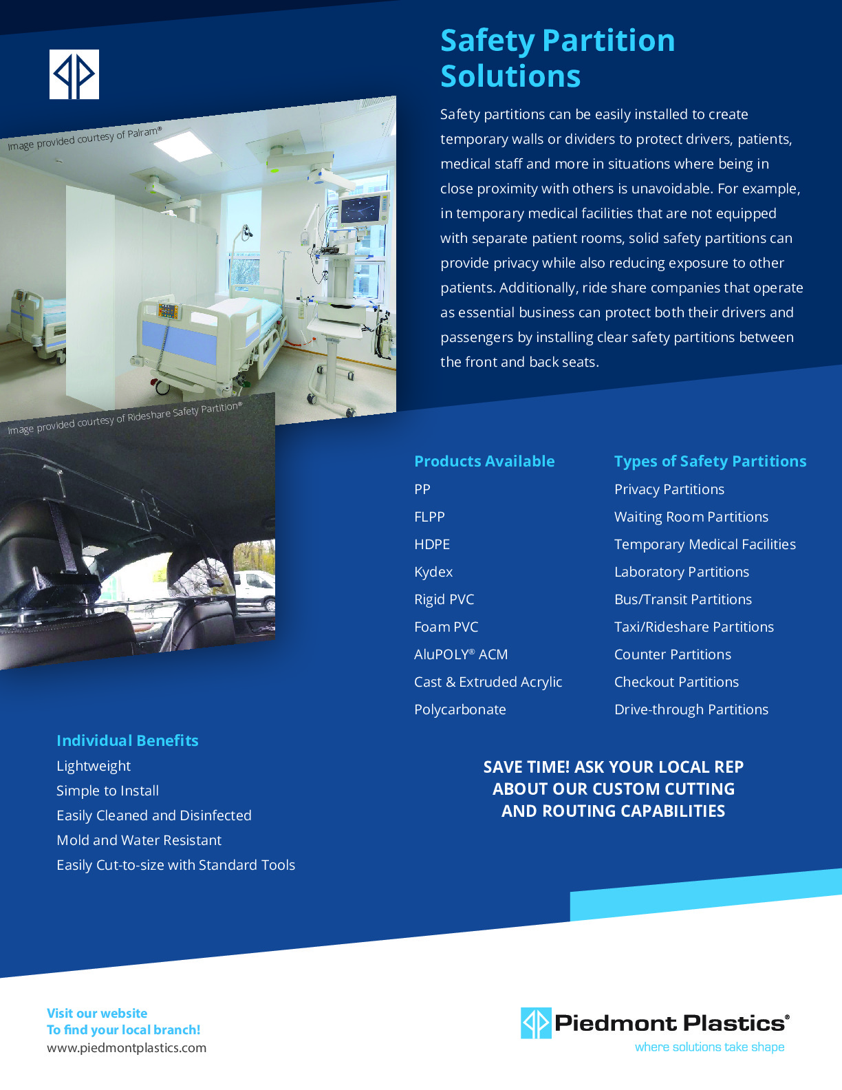 Several material solutions also meet the transportation industry requirements for flame, smoke, and toxicity specifications. In addition, they are lightweight, shatter resistant, and easy to fabricate. Piedmont Plastics provides custom-cut and routing services, and ready-to-install solutions are also available upon request.