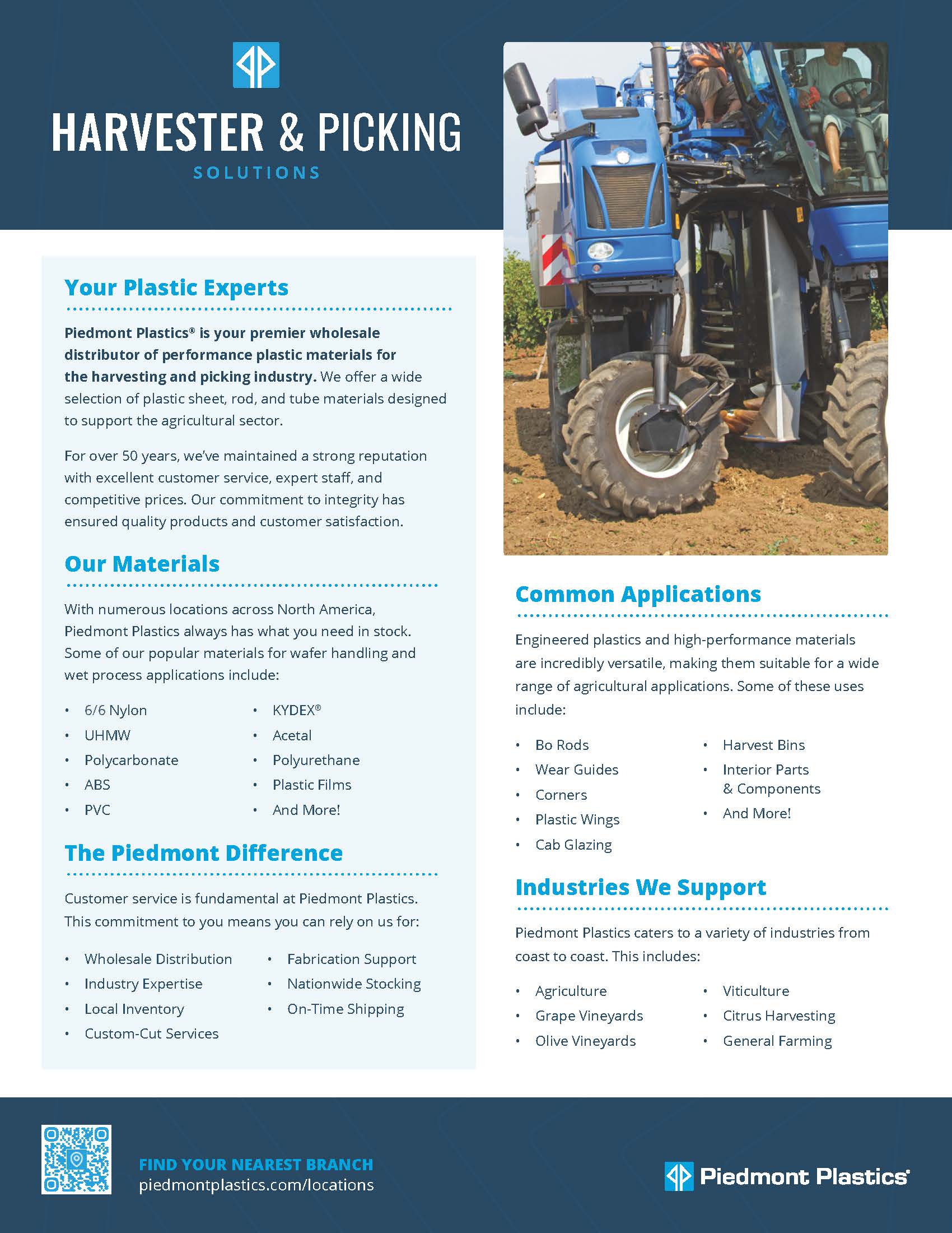 As the technology in this industry adapts, so do the capabilities of plastic materials. Whether the plastic component will be used for construction, harvesting, hauling, or conveying, Piedmont Plastics is ready to provide solutions for your heavy and agricultural equipment applications.