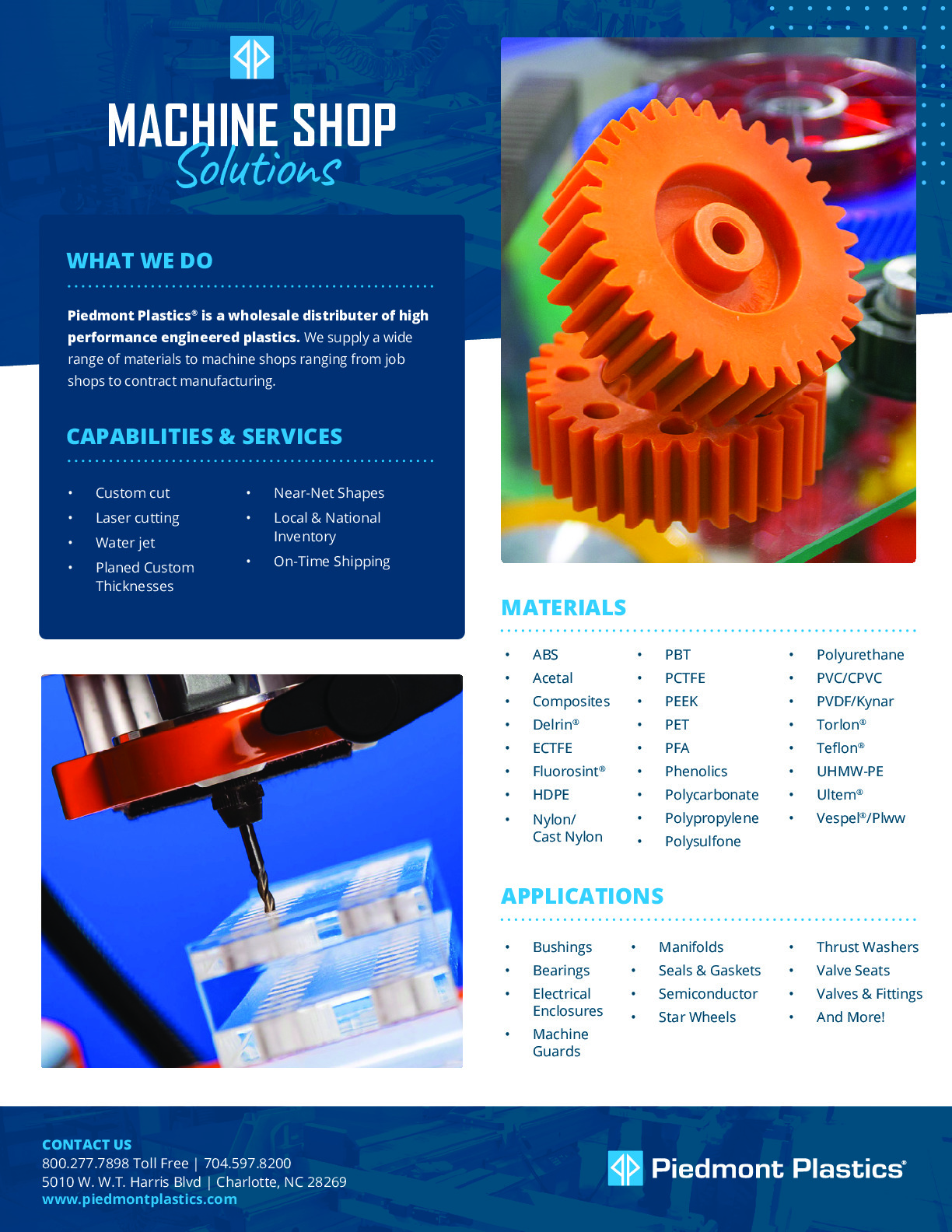 Piedmont Plastics supplies high performance materials and engineering plastics for engineers, designers, machine shops, and fabricators.