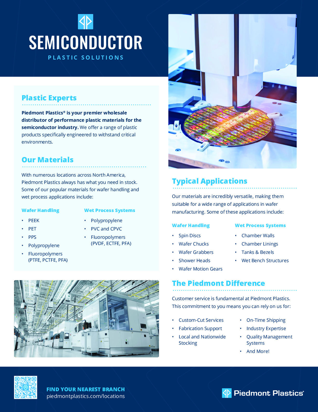 At Piedmont Plastics, our plastic solutions are used extensively throughout the semiconductor industry, especially where high temperature and high purity processing is required. Our plastic materials are dimensionally stable at high and low temperatures, provide clean and contaminant-free surfaces, and are not affected by harsh chemicals, strong acids, or solvents.