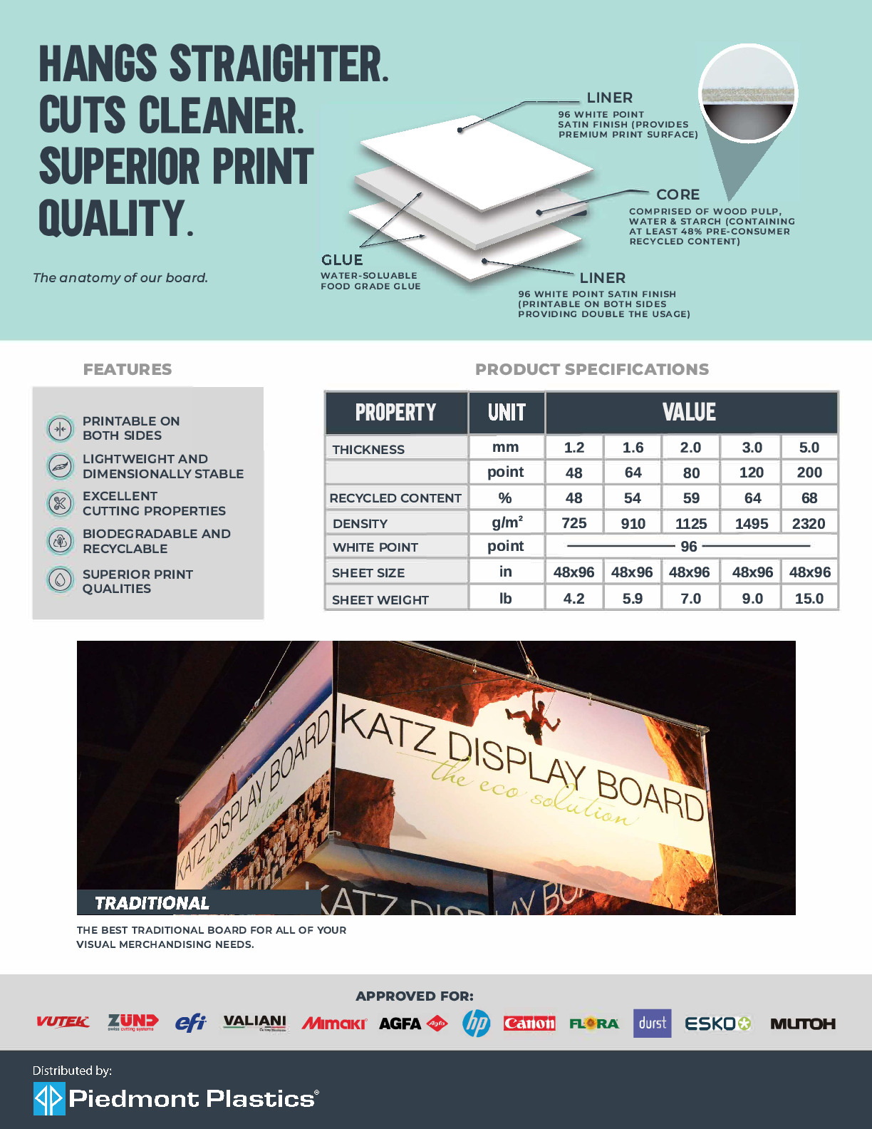 Eco-digital sheet is compatible with most direct digital printing, screen printing, and vinyl mounting applications. For best results, confirm compatibility with your Piedmont Plastics sales representative before printing, and always follow the manufacturer’s recommended guidelines.