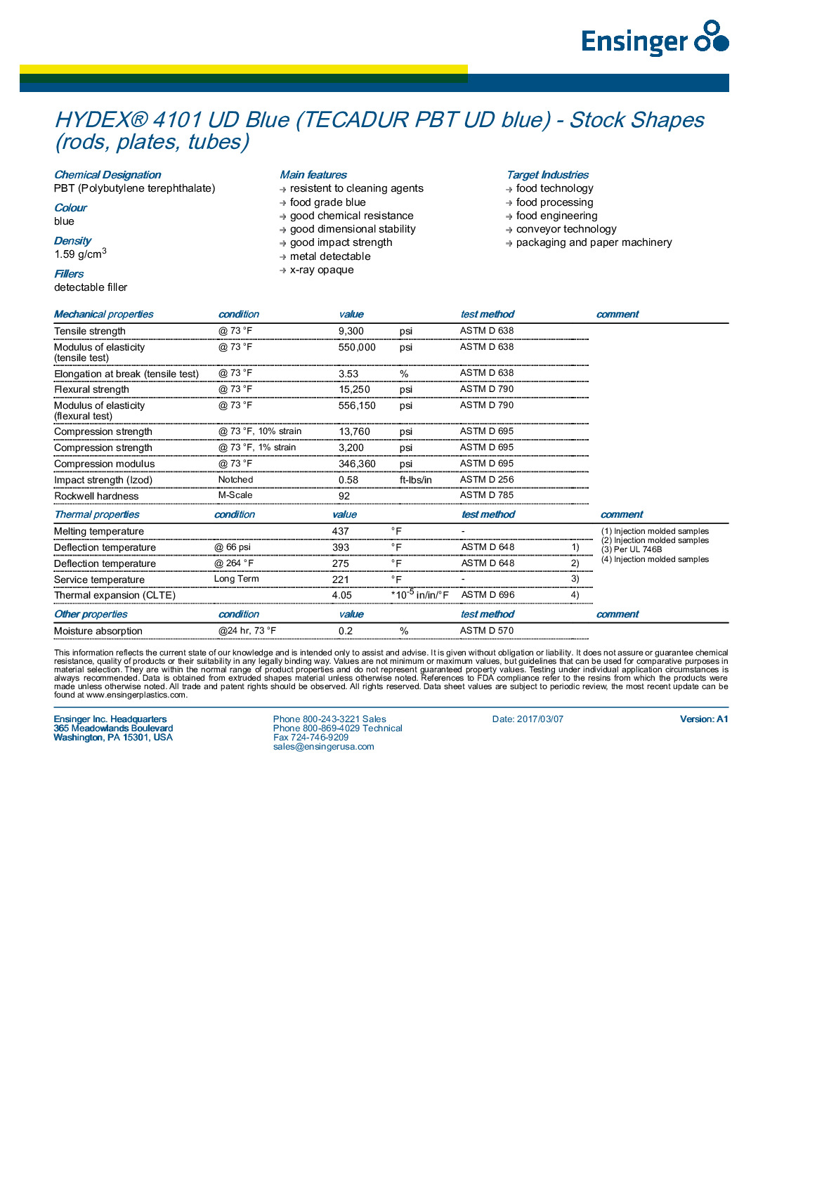 - Moisture Absorption at Equilibrium 0.1 - 0.4 %