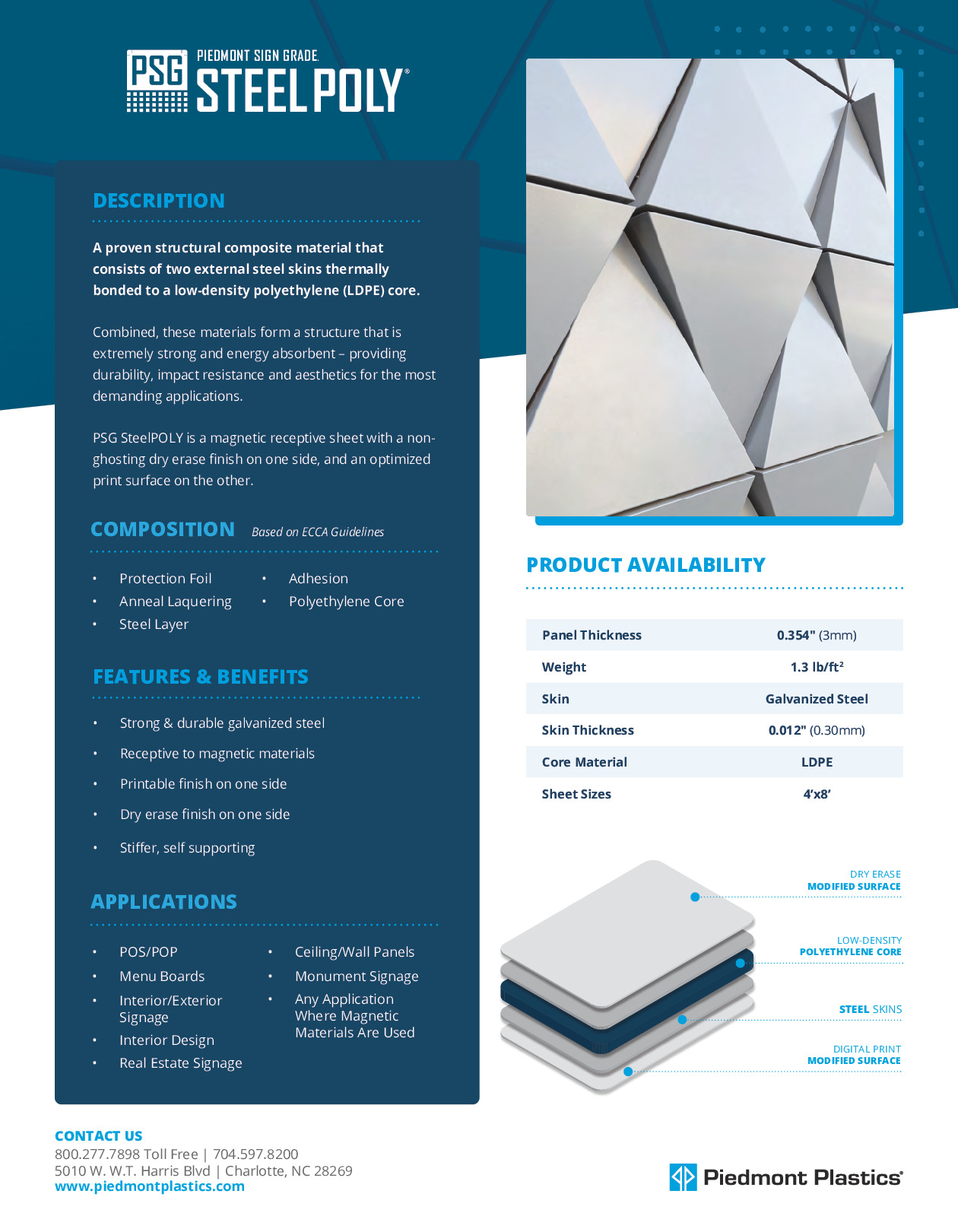 Piedmont Plastics is your trusted plastic sheet distributor and supplier of steel composite material. Also known as SCM, our steel composite is a proven structural composite material featuring two external steel skins thermally bonded to a polyethylene core. This combination creates a strong, durable, and aesthetically pleasing material perfect for a variety of demanding applications, from displays and signage to interior design.